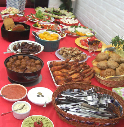 Wat dacht u van een gevarieerd buffet van warme en koude gerechtjes met overheerlijke broodjes en dipsauzen? Om je vingers bij af te likken!
